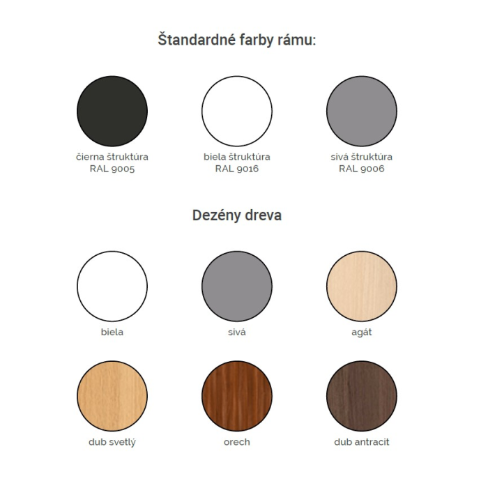 • štandardné farby dezénu dreva: biela, sivá, agát, dub svetlý, orech, dub antracit