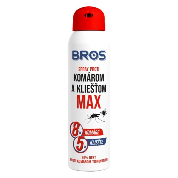 Sprej Bros proti komárom a kliešťom MAX 90 ml odpudzuje komáre, aj tie tropické, po dobu 8 hodín, kliešte po dobu 5 hodín a muchy po dobu 9 hodín. S vysokou koncentráciou aktívnej zložky DEET (30 %) zaručuje dlhodobú ochranu proti hmyzu sajúcemu krv a chorobám, ktoré prenáša. Aplikujte na oblečenie či miesta náchylné na uhryznutie zo vzdialenosti 15 cm. Pri nanášaní na krk či hlavu produkt nastriekajte najprv do dlaní a následne naneste.