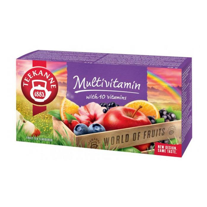 Ovocno-bylinný čaj aromatizovaný, s ovocnou príchuťou a s 10 vitamínmi.