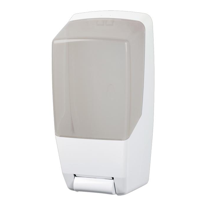 Dávkovač na abrazívne mydlo. Celoplastový, biely, s plexisklovým priezorom, ľahko ovládateľný a nenáročný na údržbu.