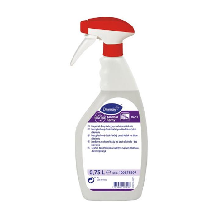 Dezinfekčný prostriedok na sprejovú aplikáciu v priebehu pracovného procesu a aj na konečnú dezinfekciu. Prostriedok je možné použiť na povrchy prichádzajúce do styku s potravinami, rýchlo sa z povrchu odparuje a nezanecháva rezíduá. Možno použiť na povrchy odolné voči alkoholu, napr. pracovné dosky, stroje a predmety, dosky na krájanie alebo nože. Je tiež vhodný na sanitáciu stojanov na potraviny v supermarketoch, mäsiarstve a pod. Suma Alcohol Spray D4.12 je na báze etanolu, ktorý má optimálnu biocídnu účinnosť. Má široké spektrum účinnosti a je efektívny proti väčšine vegetatívnych foriem mikroorganizmov.