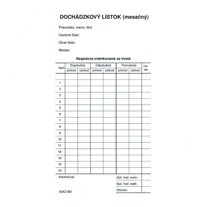Tlačivo : Dochádzkový lístok mesačný (kartón).