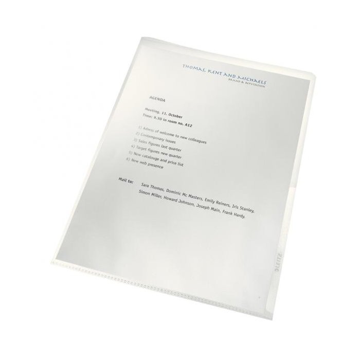 Ekologický priehľadný obal `L` na dokumenty vyrobený zo 100% priemyselného polypropylénu PP. Súčasť ekologického radu Leitz Re:cycle. Zo 100% recyklovaného a 100% recyklovateľného materiálu. Embosovaná PP fólia 0,14 mm (Copysafe). Vykrojenie pre jednoduchšiu manipuláciu s dokumentmi. Pre formát A4. Kapacita: 40 listov A4 (80 g/m2)