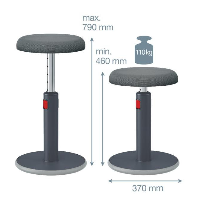 Ergonomická stolička Leitz Ergo umožňuje flexibilný pohyb medzi sedením a státím pri práci, podporuje pohyb svalov, zlepšuje držanie tela a zvyšuje hladinu energie. Má zaoblenú základňu, ktorá podporuje aktívny pohyb otáčaním a hojdaním. Pri práci zároveň posilňujete chrbtové svaly. Výšku možno ľahko nastaviť v rozmedzí 46-79 cm, stolička zostáva pevná a stabilná v akejkoľvek výške. Stolička je pohodlná a praktická, má sedadlo z priedušnej 3D peny potiahnuté vzdušnou sieťovinou protišmykovú základňu, ktorá nepoškodí podlahu. Maximálna nosnosť: 110 kg. Farba sivá.