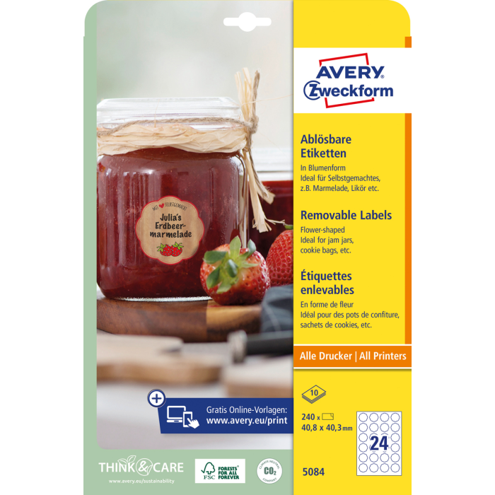 Etikety v tvare kvetu 40,8x40,3mm Avery 10 hárkov biele