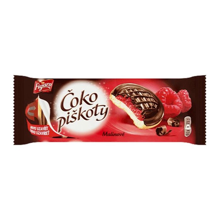 Jemné pečivo so želé (52%) s malinovou príchuťou polomáčané v čokoláde (15%).