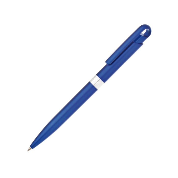 Plastové guľôčkové pero FIROL v metalických farbách. Uprostred pera je stieborný krúžok. Modrá náplň veľkoobjemová. Kolekcia DESIGN. Farba modrá.