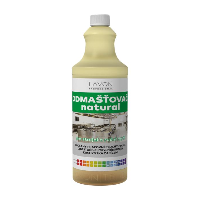 Lavon odmašťovač natural 1 l je špeciálny, silno alkalický, nízkopenivý čistič na vysoko znečistené podlahy a mastné umývateľné povrchy. Svoje uplatnenie si nájde v domácnosti, kuchyni, priemyselnej výrobe i gastronomických prevádzkach a reštauráciách. Popis vlastností odmasťovača plôch Lavon Prevedenie extra silný, pre strojné i ručné umývanie - priemysel, gastro a inštitúcie.