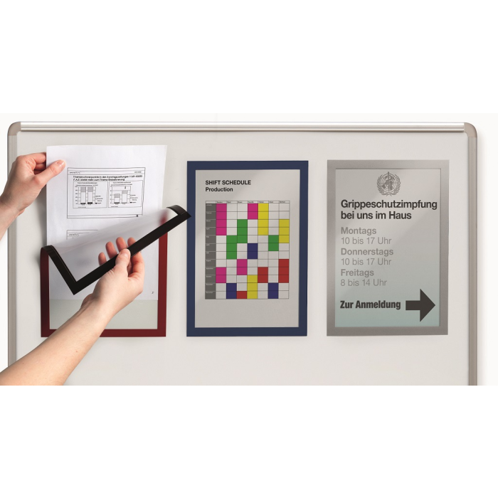 Informačný panel s magnetickou časťou na zadnej strane rámika na jednoduché a rýchle vkladanie informácie formátu A4. Vhodný na hladké magnetické povrchy, napr. magnetickú tabuľu. Farba červená. V balení 5 ks.