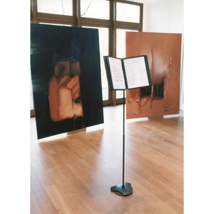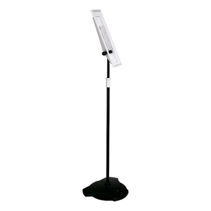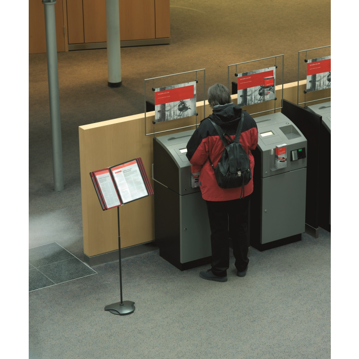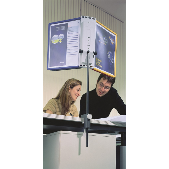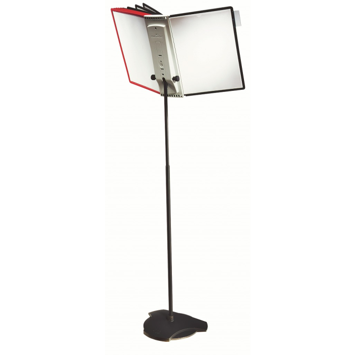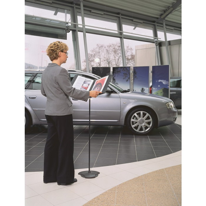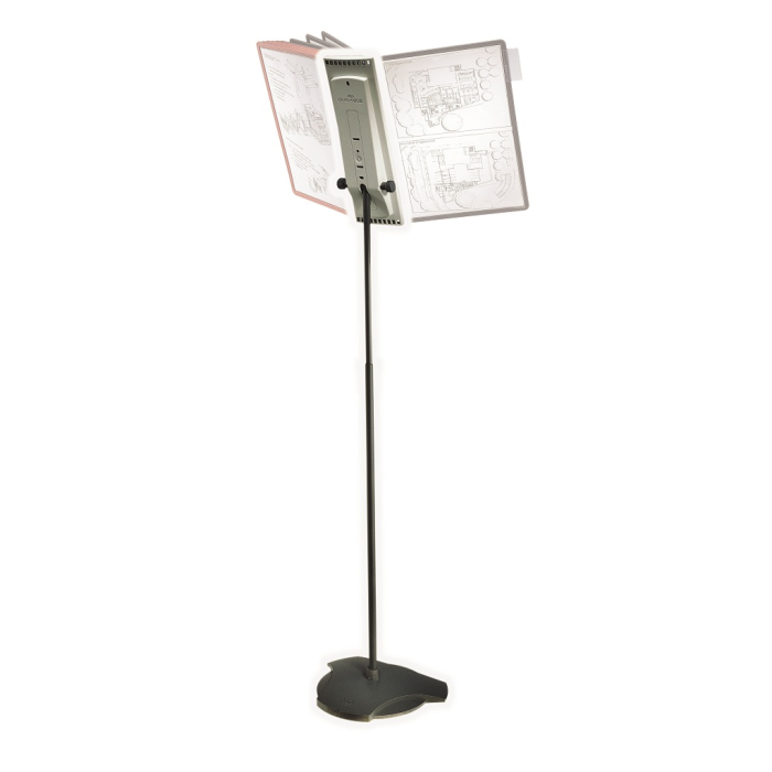 Podlahový statív na 10 panelov s pevným oceľovým podstavcom. Nastaviteľná výška 61 až 110 cm a uhol sklonu od 5 do 90 stupňov. Dodávaný bez katalógových panelov. Hmotnosť 4,9.kg. Farba antracitová/sivá