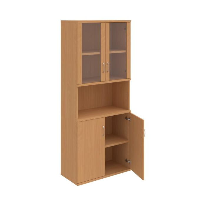 Kombinovaná skriňa - dvere/nika. Kancelárske skrine STRONG majú robustnú konštrukciu a vyššiu nosnosť políc ako bežné kancelárske skrine.V ponuke sú skriňové moduly s výškou 185 cm, 111 cm alebo 74 cm a šírky 80 cm alebo 40 cm. Hĺbka všetkých modelov skriňového radu STRONG je 40 cm.Chrbát, vyrobený z 8 mm hrubých dosák, je obojstranne pohľadový, takže skrine môžete použiť ako priestorový deliaci prvok. Hrúbka samotných políc je 25 mm, čo znamená nosnosť 80 kg na 1 policu.Korpusy, dvierka a police skríň sú olepené odolnou 2mm ABS hranou, ktorá garantuje dostatočnú ochranu proti poškodeniu.