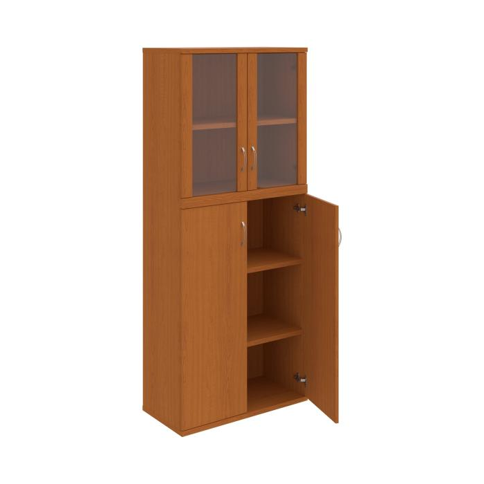 Kombinovaná skriňa - dvere/nika. Kancelárske skrine STRONG majú robustnú konštrukciu a vyššiu nosnosť políc ako bežné kancelárske skrine.V ponuke sú skriňové moduly s výškou 185 cm, 111 cm alebo 74 cm a šírky 80 cm alebo 40 cm. Hĺbka všetkých modelov skriňového radu STRONG je 40 cm.Chrbát, vyrobený z 8 mm hrubých dosák, je obojstranne pohľadový, takže skrine môžete použiť ako priestorový deliaci prvok. Hrúbka samotných políc je 25 mm, čo znamená nosnosť 80 kg na 1 policu.Korpusy, dvierka a police skríň sú olepené odolnou 2mm ABS hranou, ktorá garantuje dostatočnú ochranu proti poškodeniu.