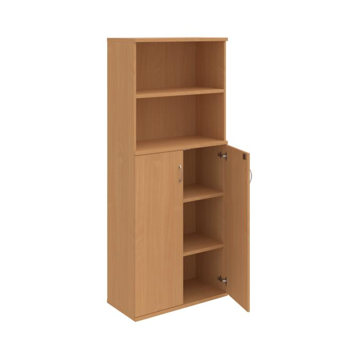 Kombinovaná skriňa - dvere/nika. Kancelárske skrine STRONG majú robustnú konštrukciu a vyššiu nosnosť políc ako bežné kancelárske skrine.V ponuke sú skriňové moduly s výškou 185 cm, 111 cm alebo 74 cm a šírky 80 cm alebo 40 cm.Hĺbka všetkých modelov skriňového radu STRONG je 40 cm.Chrbát, vyrobený z 8 mm hrubých dosák, je obojstranne pohľadový, takže skrine môžete použiť ako priestorový deliaci prvok. Hrúbka samotných políc je 25 mm, čo znamená nosnosť 80 kg na 1 policu.Korpusy, dvierka a police skríň sú olepené odolnou 2mm ABS hranou, ktorá garantuje dostatočnú ochranu proti poškodeniu.