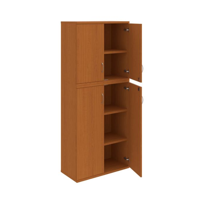 Kombinovaná skriňa - dvere/nika. Kancelárske skrine STRONG majú robustnú konštrukciu a vyššiu nosnosť políc ako bežné kancelárske skrine.V ponuke sú skriňové moduly s výškou 185 cm, 111 cm alebo 74 cm a šírky 80 cm alebo 40 cm. Hĺbka všetkých modelov skriňového radu STRONG je 40 cm.Chrbát, vyrobený z 8 mm hrubých dosák, je obojstranne pohľadový, takže skrine môžete použiť ako priestorový deliaci prvok. Hrúbka samotných políc je 25 mm, čo znamená nosnosť 80 kg na 1 policu.Korpusy, dvierka a police skríň sú olepené odolnou 2mm ABS hranou, ktorá garantuje dostatočnú ochranu proti poškodeniu.