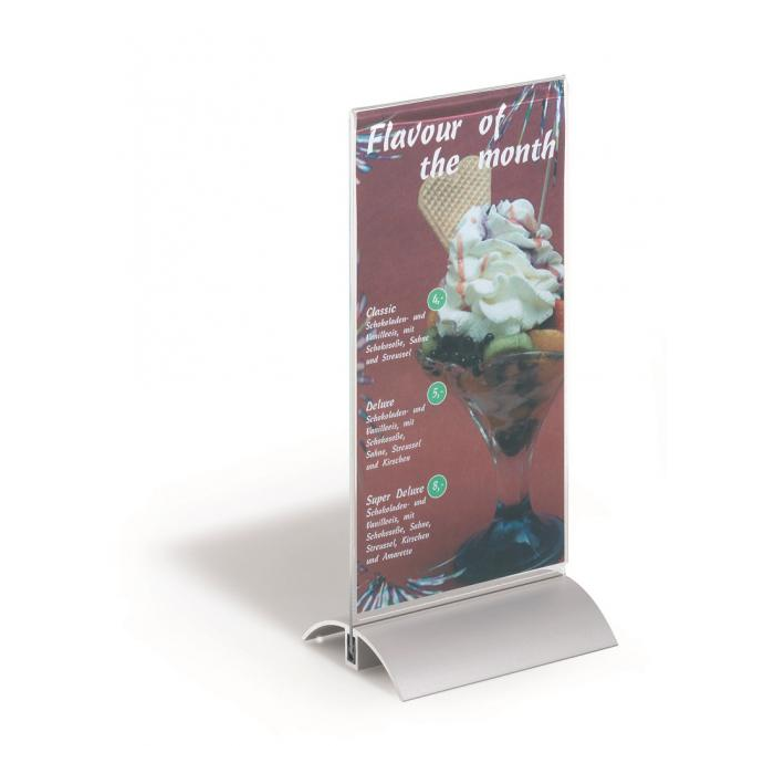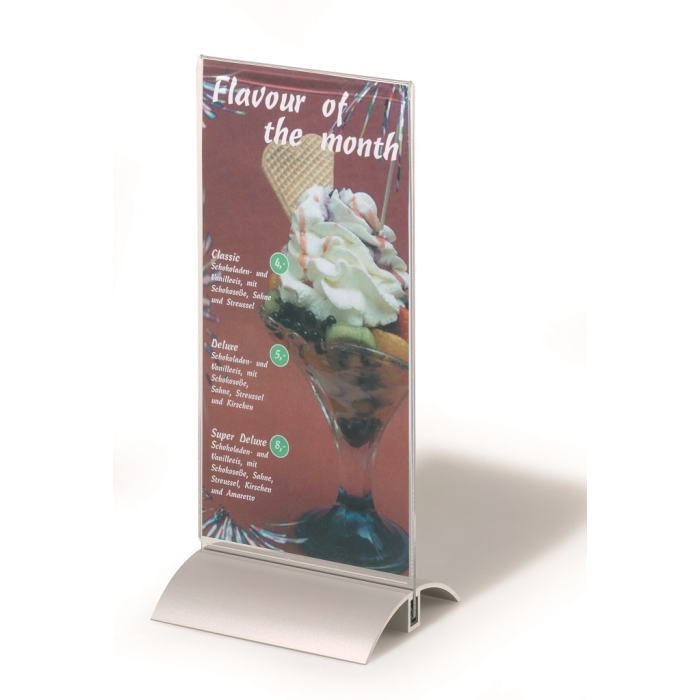 Stojan vhodný na prezentáciu ľubovoľných informácií s dobrou stabilitou. Vrchná časť vyrobená z kvalitného číreho akrylu, elegantný podstavec z hlíníka.