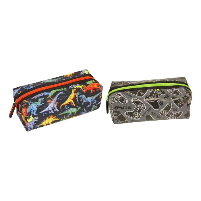Puzdro na perá s 1 zipsom, 2 rôzne motivy (herný / dinosaurov), materiál polyester.