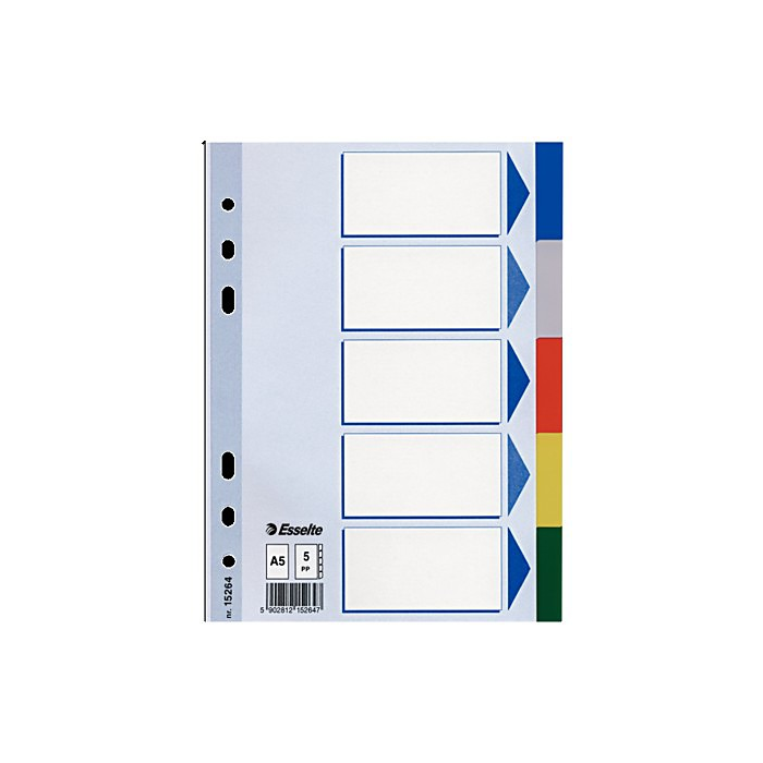 Register (rozraďovač) A5 obsahuje plastové rozlišovače pre farebné triedenie dokumentov v zoraďovačoch či doskách. Päť plastových hárkov vo formáte A5 a v piatich farbách. Popisovateľný titulný list pre jednoduchú orientáciu v zakladaných dokumentoch. Univerzálna multiperforácia umožňuje založenie do krúžkového i pákového zoraďovača. Rozmer: 210 x 163 mm.