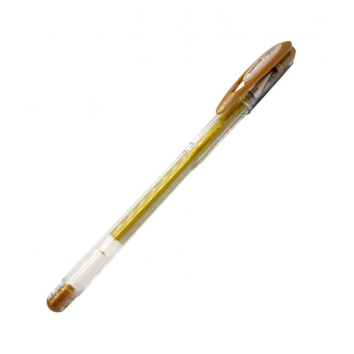 Jednorazový gélový roller s vlastnosťami uni Signo vo farbách kovov. Väčšie balenie 12 ks v jednej farbe. Guľôčka 0,8 mm, šírka stopy 0,5 mm. Farba: zlatá