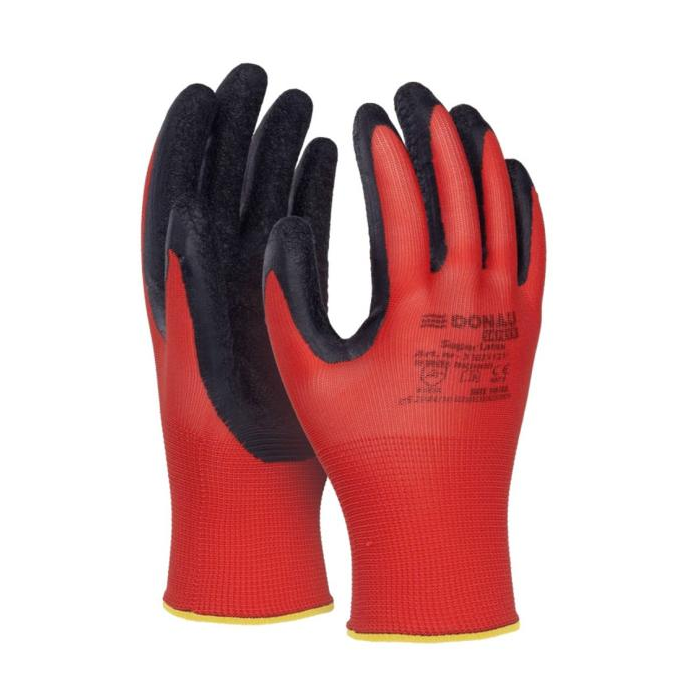rukavice z kvalitnej pletenej polyesterovej tkaniny červenej farby, v úchopovej časti potiahnuté zdrsneným latexom čiernej farby