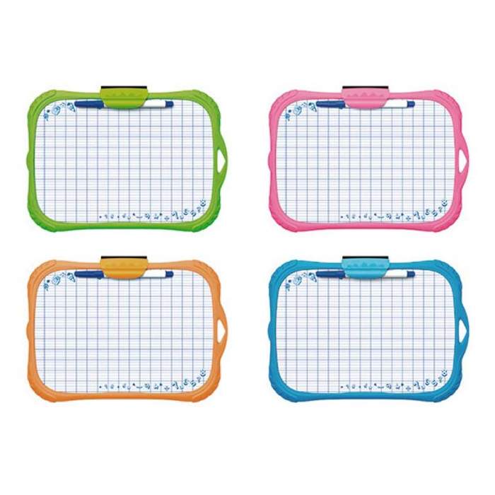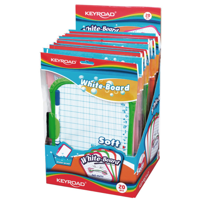 Tabuľka KEYROAD Mini na sucho stierateľná, obojstranná (hladká/kockovaná). Protipráskavý náter, flexi, umývateľný, farebné gumené rámy. Fixka a mini hubka súčasťou balenia. Závesná konzola, rozmer: 205 x 287 x 17mm. Farba dosky: biela, farba rámu: mix farieb.
