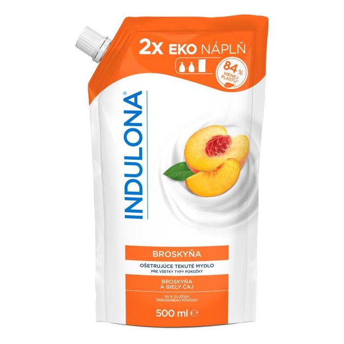 Indulona Ošetrujúce tekuté mydlo BROSKYŇA s výťažkami z broskyne a bieleho čaju bolo špeciálne vyvinuté tak, aby poskytovalo účinné čistenie a jemnú starostlivosť pokožke rúk.Zloženie obohatené o prírodné zložky s hydratačnými vlastnosťami pomáha zanechať po umytí pokožku rúk jemnú a vláčnu. 93 % zložiek prírodného pôvodu. Vhodné na každodenné použitie, pre celú rodinu. Pre všetky typy pokožky. Dermatologicky testované. Ekonomické balenie 500 ml