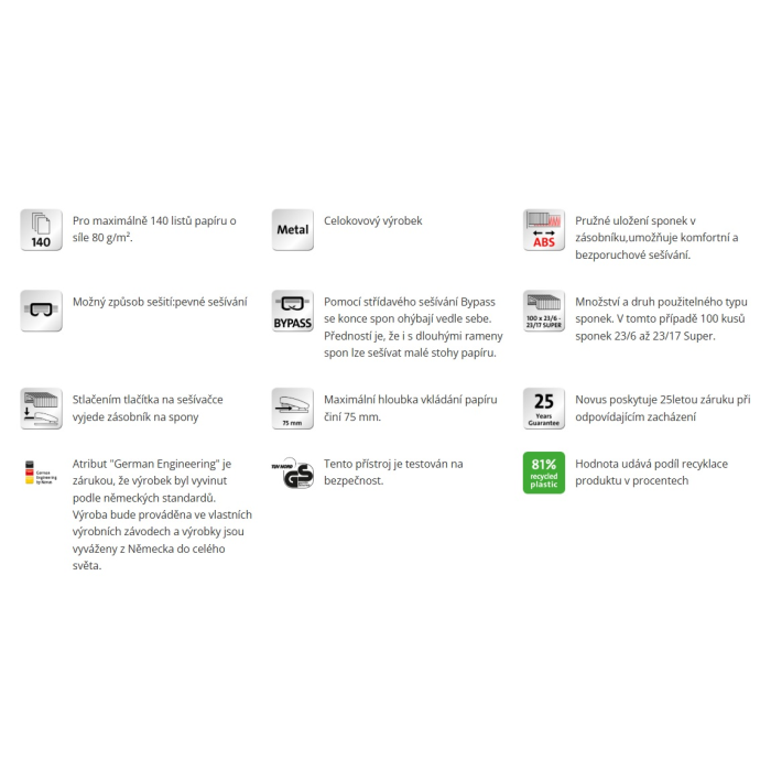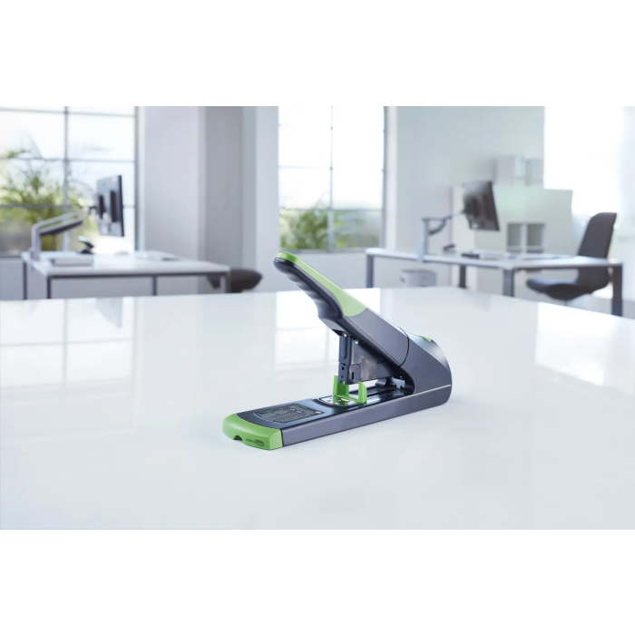 Veľkokapacitná zošívačka pre profesionálne použitie z kolekcie šetrnej k životnému prostrediu re+new. Kapacita súčasne zošitých listov až do 140 listov. Celokovová s plastovým krytom. Systém ABS pre bezproblémové zošívanie bez zaseknutia spiniek. vrchná časť je z 81% recyklovaného plastu. Kapacita náplne 100 spiniek 23/6 až 23/17 Super. Hĺbka zošívania 7,5 cm. Hmotnosť 1460 g. Záruka 25 rokov. Farba čierna.