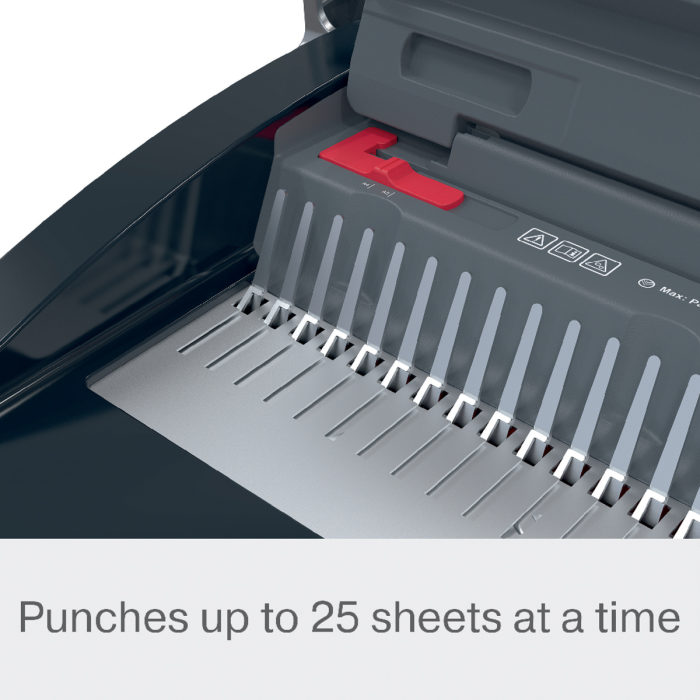 • presekne až 25 listov papiera s gramážou 80 g/m² formátu A5/A4 naraz a efektívne zviaže až 390 listov naraz pomocou 45 mm chrbtov