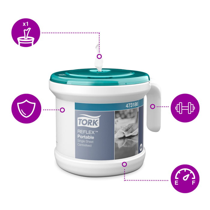 Zásobník TORK Reflex™ na jednotlivo dávkované utierky so stredovým odvíjaním je ideálny na utieranie rúk a povrchov pre profesionálne prostredie. Z dôvodu dávkovania po jednom útržku sa dotknete len toho, čo použijete, čím sa znižuje riziko krížovej kontaminácie a vďaka otočnému dávkovaču budete mať prístup k papieru z akéhokoľvek uhla. Tento jednoducho použiteľný, hygienický a odolný systém znižuje spotrebu utierok až o 37 %. Dodávame spolu s 1 bielym 2-vrstvovým kotúčom Reflex so stredovým odvíjaním