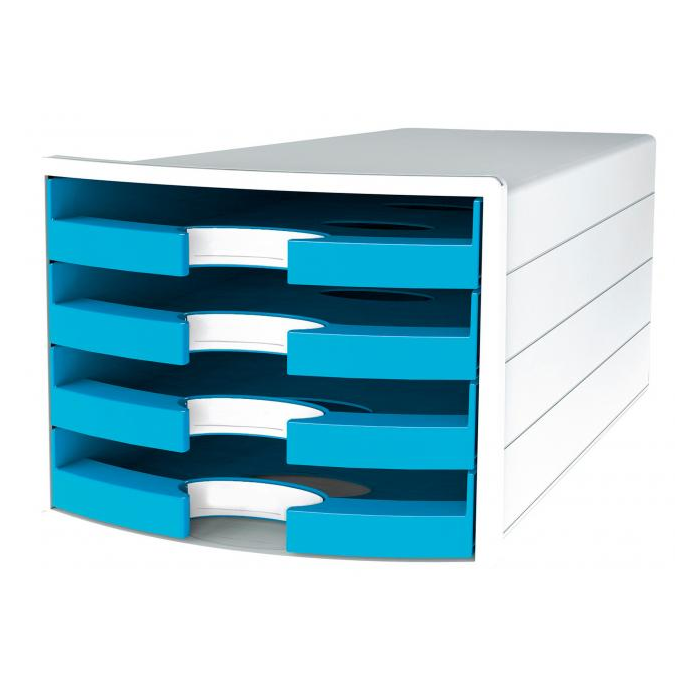 Box so štyrmi otvorenými zásuvkami v tvare počítačového monitora v trendových farbách. Rozmery (š × v × h) 294 × 235 × 368 mm. Farba svetlo modrá.
