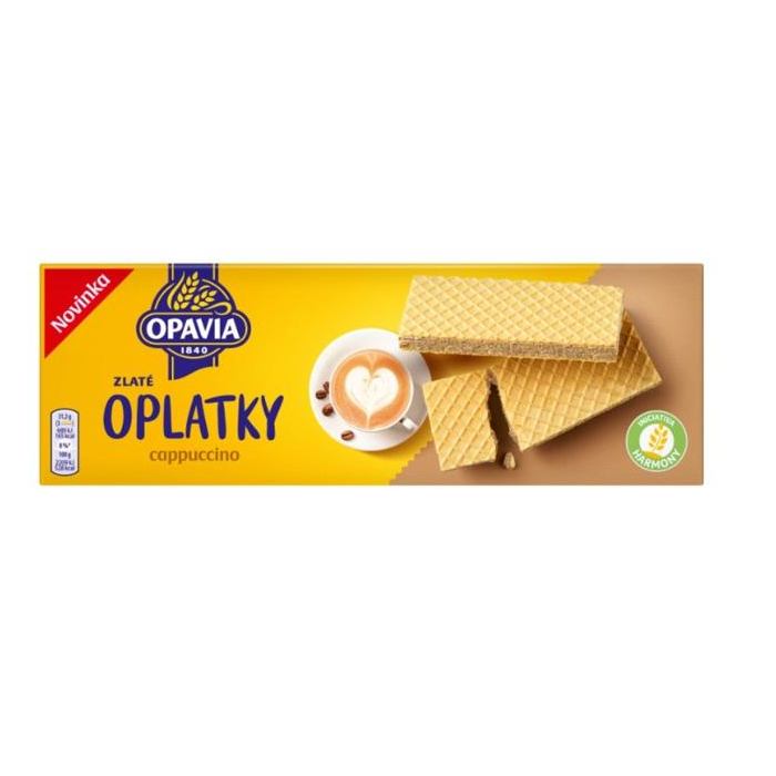 Oblátky OPAVIA s mliečno-kávovou náplňou. Hmotnosť 146 g.